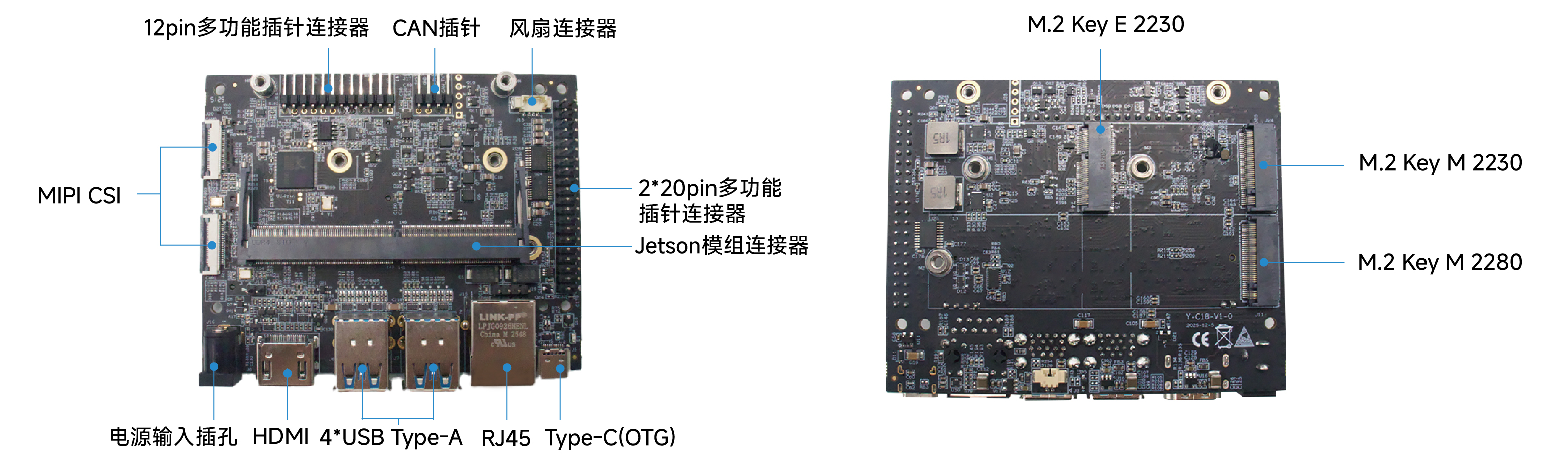 Y-C18采用工业级高可靠性设计,配备接口静电保护、电源过压与反极性保护机制,全板器件选用宽温型号,能够在复杂工业环境下稳定运行。该载板提供MIPI CSI相机接口,支持工业级图像采集设备接入;提供2个M.2 Key M插槽,可扩展2230和2280尺寸硬盘;提供1个M.2 Key E插槽,可扩展wifi模块。